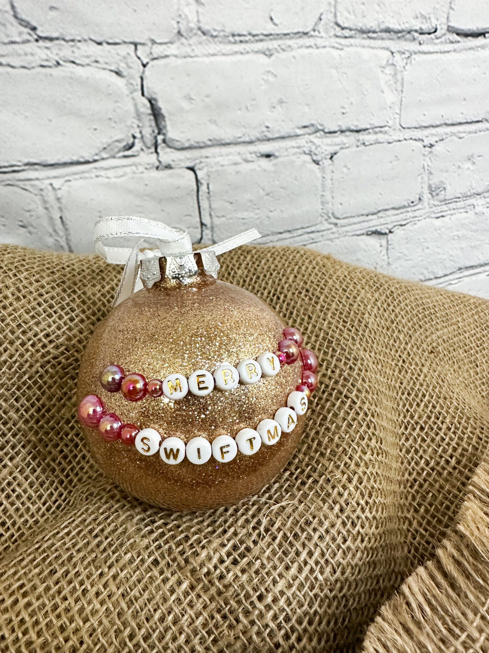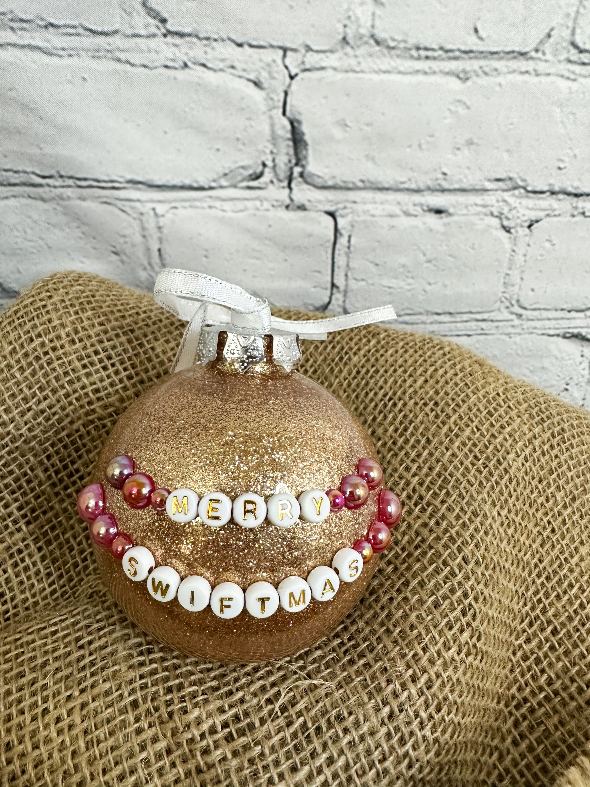 Celebrate the holidays Swiftie style with this handcrafted, glitter ornament featuring trendy letter beads that spell “Merry Swiftmas.” It’s the perfect blend of sparkle, pop-culture cheer, and handmade charm.