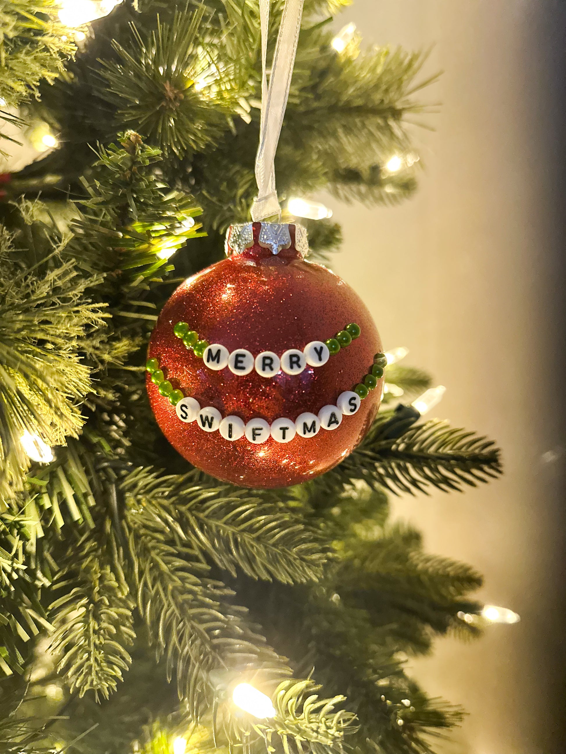 Celebrate the holidays Swiftie style with this handcrafted, glitter ornament featuring trendy letter beads that spell “Merry Swiftmas.” It’s the perfect blend of sparkle, pop-culture cheer, and handmade charm.